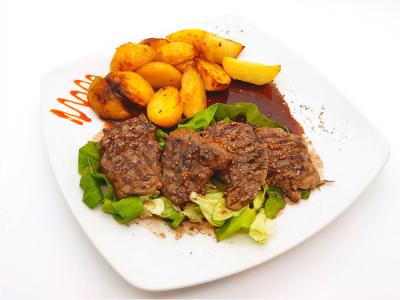 Mușchi de vită 250gr, sos gorgonzola 50gr,servit cu cartofi la cuptor 200 g