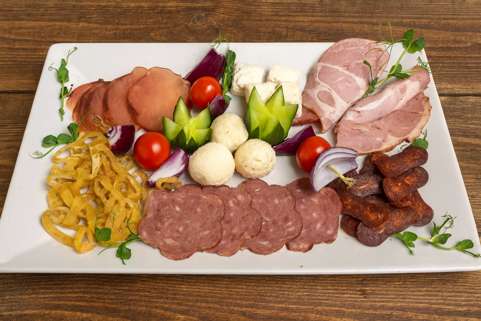 gustare pentru 2 persoane babic 30 gr ,ceafa afumata de porc 35 gr ,pastrama din muschiulet de porc afumat 30 gr ,sorici 50 gr ,salam de vita 20 gr ,crochete de branza de burduf 50 gr ,telemea de vaca 50 gr ,frigarui de rosii cherry si ceapa rosie ,castravete